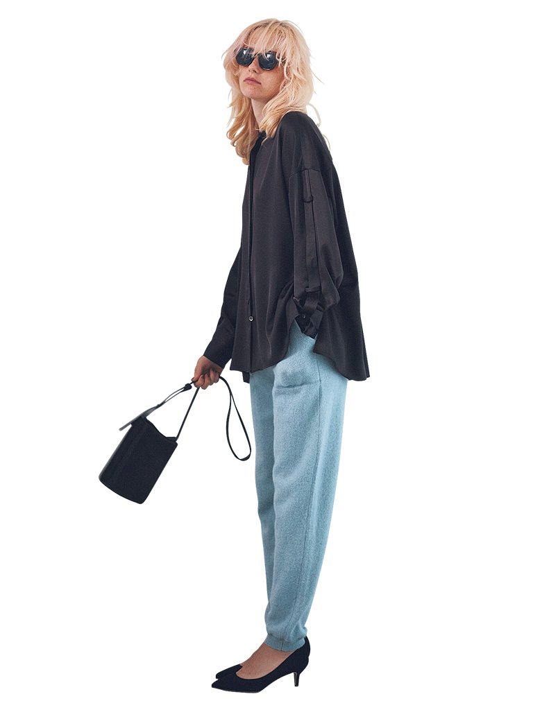 【POINT】目線を上に向けるようにトップスはビッグサイズで調整を図り、足元はヒールに頼って脚をまっすぐ見せる工夫を。トップスのブラウンは色にぬくもりがあるぶん、シルク見えするリュクスな光沢でほっこり感を微調整。