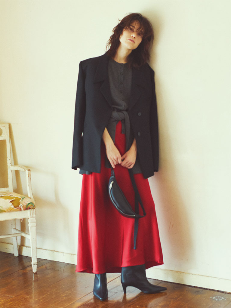光沢を放つサテン素材のフレアスカート。発色のいい赤をエレガントに傾ける、すそにかけての美しい広がりとドレープ感。シルキーな質感は、ヴィヴィッドカラーの強さを和らげつつ、ニットやコートなど重衣料の重たさを受け流す役割も。共布のウエストひもでフィット感の調節もしやすい。