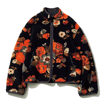 黒×オレンジ花柄ボアジャケット 63,800円/ロエフ(TABAYA United Arrows) 黒をベースに、鮮やかなオレンジの花柄が映えるボアジャケット。まるで古着のようなこなれた雰囲気で、シンプルなコーディネートのアクセントとして活躍する。ボトムスを選ばないコンパクトな短め丈で、裏地はメッシュ仕様と機能面も優秀。