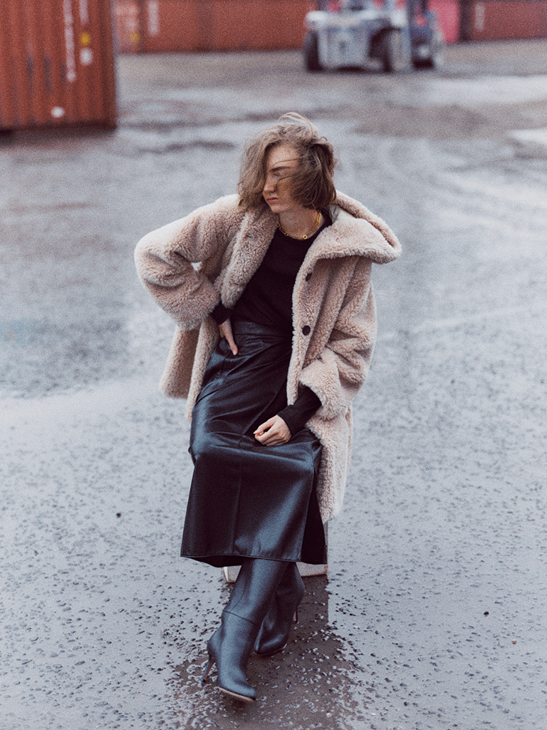 フードがあるだけでリッチなファーにも親しみが宿る。シックな黒にノーカラーのファーだとややエレガント。フードのあしらいが適度なくずし役に。