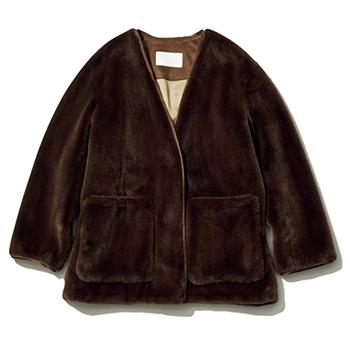 ブラウンノーカラーファージャケット 39,600円/ボールジィ(トゥモローランド) 装飾を削ぎ落としたノーカラーが、素材そのもののリッチさを際立たせる。ほのかにツヤを感じるしっとりとしたブラウンのファーは、デニムなどのカジュアルなボトムと合わせても品よくまとまる。カーディガンのように気軽に羽織れる軽やかさも魅力。
