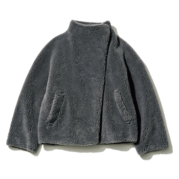 グレースタンドカラーボアコート 36,300円/HER. どうしてもほっこりしがちなボア素材を、都会的なグレーとアシンメトリーなフロントデザインでクールに昇華。タートルネックのように高く設定されたスタンドカラーが首元を温かく包み込み、モードな印象も加速させる。着脱がスムーズなスナップボタン仕様。