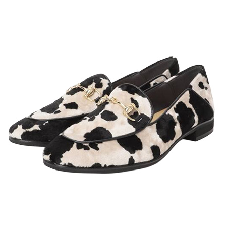牛柄ローファー(2) 13,750円/ル タロン(ル タロン 有楽町マルイ店) しっとりとした起毛素材×ゴールドの輝きで大人っぽさはキープ。ほっそりとしたフォルムだから、柄にインパクトがあっても合わせやすい。