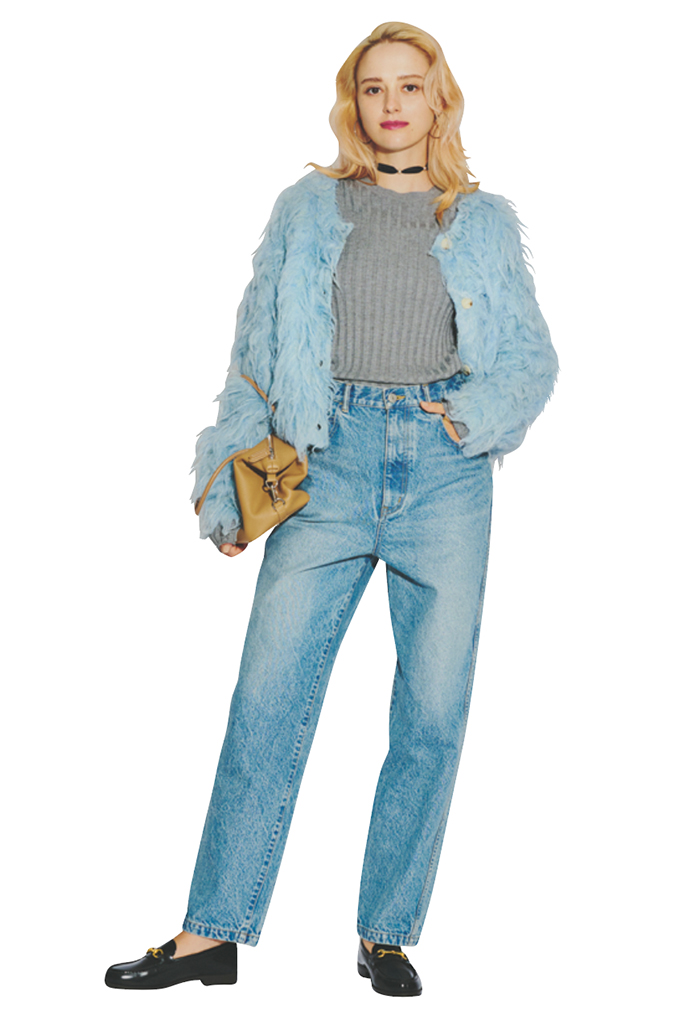 ブラックローファー(2.3) 16,500円/ハルタ×フリークス ストア(フリークス ストア渋谷) ブルーカーディガン 18,700円/アールビーエス(レイビームス 新宿) 中に着たグレーニット 19,800円/エイチ ビューティー&ユース デニムパンツ 28,600円/THE SHINZONE(Shinzone ルミネ新宿店) フープピアス 3,080円/アネモネ(サンポークリエイト) チョーカー 52,800円/カミーユ スロ/オブリオ(オブリオ) バッグ 21,450円/アンドミューク(アマン)