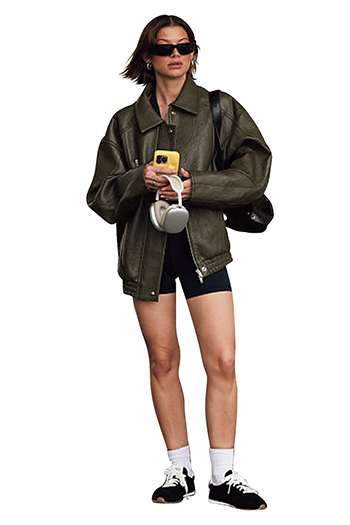 潔く脚を出すときは、陰をひそめるように要素をしぼった足元に。すると、自然と目線が上に誘導され足が長く見える算段。腰から下がさっぱりしているぶん、トップスはレザーを選んでバランス調整。