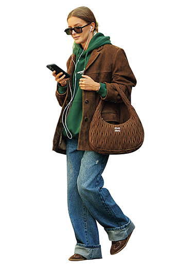 足元はシャープにまとめるのが大人っぽくて好き。シンプルなワイドボトムが多い今、そのラインをくずさない華奢さが合わせやすいです。秋冬らしいカーキのスエード素材はアクセントにもなり、シックで上品に仕上がる。(スタイリスト・樋口さん)
