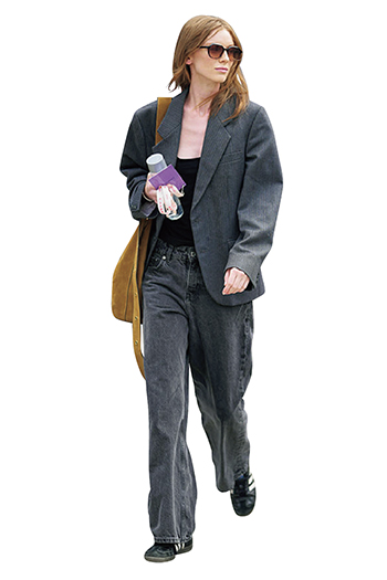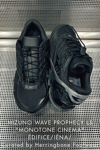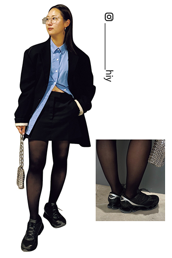 今季購入したのは、「MIZUNO」と「Herringbone Footwear」のコラボレーションモデル「MONOTONE CINEMA」。ソールはボリューミィですがシャープさもあり、ヒールをはくような感覚でとり入れています。MY定番の黒ジャケットは、ミニボトムにシアータイツを重ねてレディに寄せたい気分。スニーカーが装いのちょうどいい抜け感に。(Herringbone Footwear Press/Shop staff・Hiyoriさん)