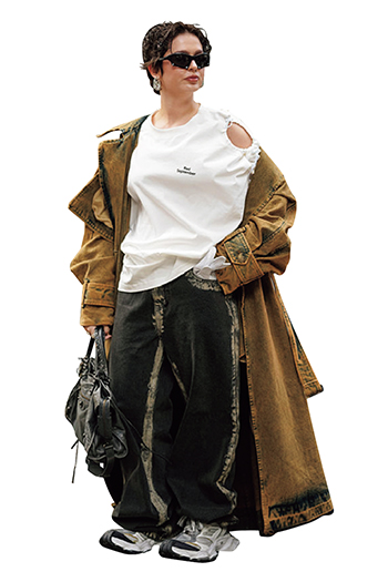 モードストリートな雰囲気に負けない、存在感のあるダッドスニーカー。ソールの厚さに加え、横にもせり出したシルエットが、全部ずるっとさせたコーディネートの統一感をさらに後押し。