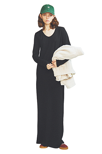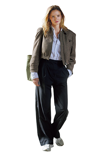 冬服は色みが暗く、ボリュームもあるため重たい印象になりがち。さし色としてカラースニーカーを投入することで、手軽にトーンアップが図れます。薄底のレトロな雰囲気だと、派手さが悪目立ちせず使いやすい。(スタイリスト・出口さん)