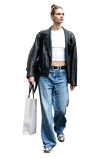 足元に悩むことの多いやんちゃなワンツーとちぐはぐしないのもスニーカーの強み。色あせたワイドデニムには、すそが自然にワンクッションするランニングシューズのすぎないボリュームが好都合。