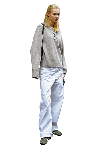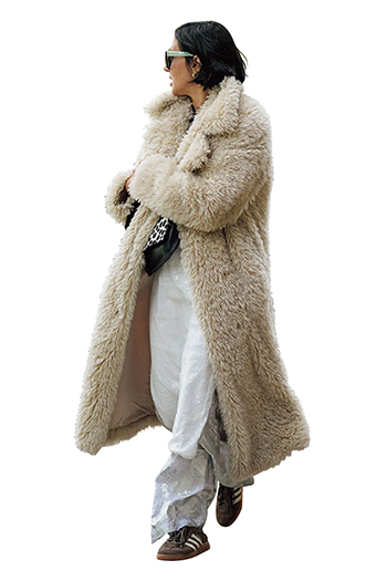 インパクトのあるコートがメインなら、足元はスニーカーでさらっと流すのがバランス上手の常とう手段。ボリューミィな白1色を間のびさせず、適度に締める色あせたブラウンをセレクト。