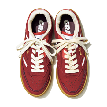 ヴィーガンレザーを使用したローテクスニーカー。冬の装いになじみつつしっかりと主張してくれる、差し色に向く沈みすぎないバーガンディ。タンとヒール部分に使用したメリハリのつく朱赤がポイント。