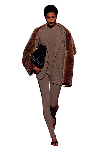 上半身にボリュームを集め、タイトな足元を引き立て。旬のブラウンにキレを加える役割としても、大きな黒は効果的。