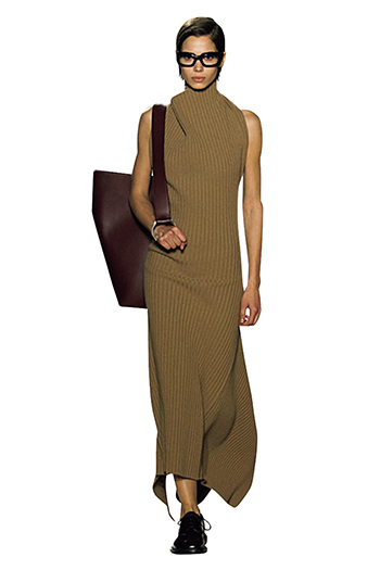 ワンピの華奢なラインは保ちつつ、バッグで立体感を補填。ニットワンピースの心地よさにも浮かないのがショルダーバッグの強み。