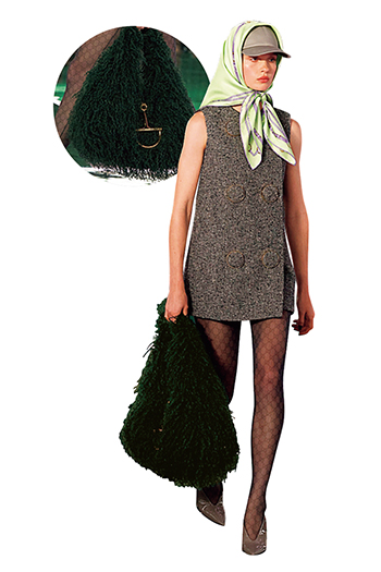 ブランドアイコンのホースビットも、モンスターのような毛並みをまとって遊び心ある見た目に。細身のミニワンピの緊張感をセーブ。