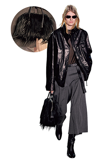 シックな黒のファーで、レザージャケットの強さを緩和。毛足の長いタイプを選ぶことで、エッジの効いたオールブラックがマイルドに。