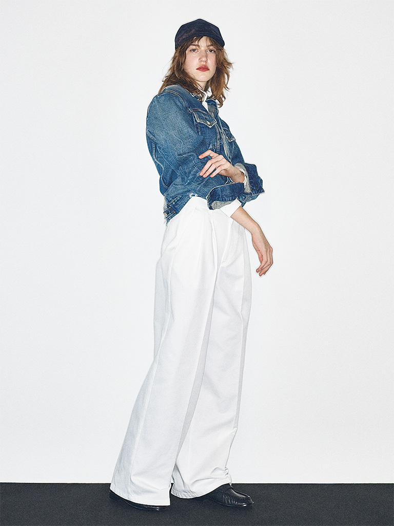 【POINT】シルエットでハズすマニッシュスタイル。デニムジャケットは、フロントだけウエスト部分にひっかけてコンパクトに見せ、パンツの存在感を発揮。