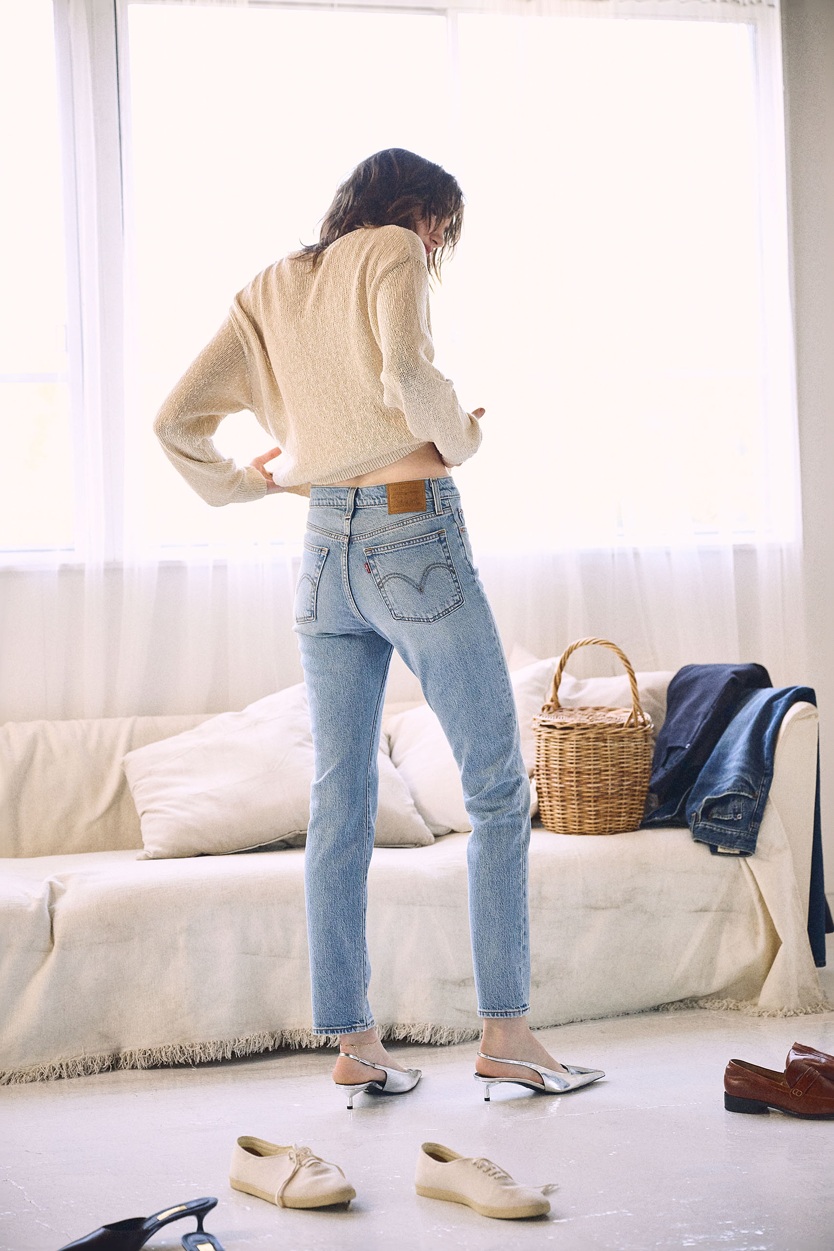 「Wedgie Slim」デニムパンツは着まわし。ベージュブークレニットトップス 8,800円/Levi’s®(リーバイ・ストラウス ジャパン) シルバーリング、バッグ、ゴールドアンクレット、シルバーパンプス/以上スタイリスト私物 ドライなニットと薄色デニムのナチュラルな空気感はくずさず、形でラフさを微調整。ヒップの丸みまでキレイに見せてくれるから、後ろまで行き届いた姿に。