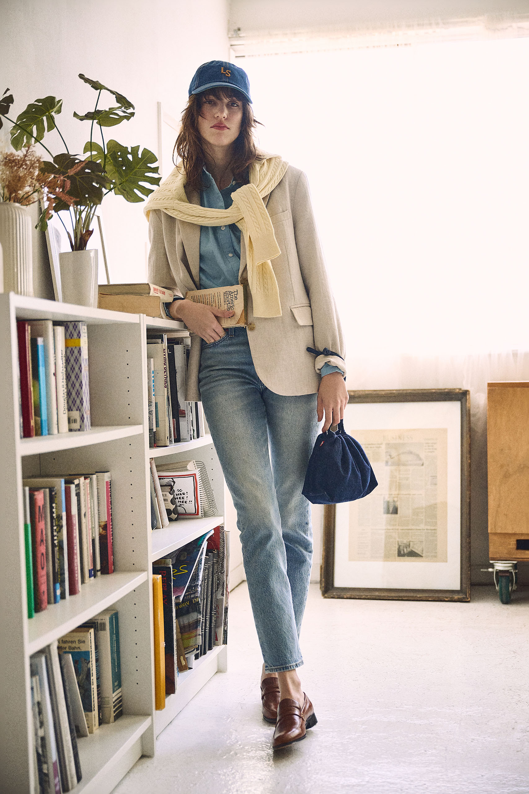 「Wedgie Slim」デニムパンツ 15,400円は着まわし。ベージュリネンジャケット 22,000円、中に着たブルーシャツ 8,800円、肩にかけたイエローニットカーディガン 9,900円、キャップ 5,500円、ベルト 6,600円、バッグ 5,500円/以上Levi’s®(リーバイ・ストラウス ジャパン) シューズ/スタイリスト私物 ジャケットの上からさらにニットも巻いてボリュームと出しても、ほっそりとしたデニムのおかげでスマートなまま。パンツよりも少し濃いデニム小物を散らしてまじめなジャケットをいっそう親しみやすく。