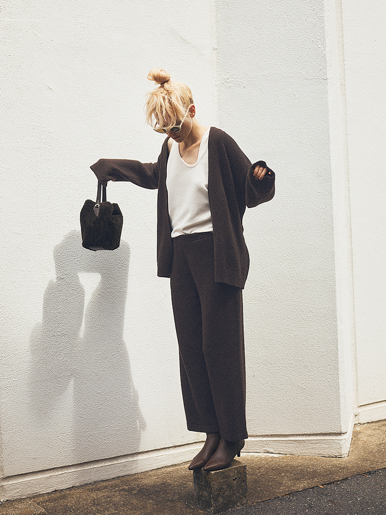 ニットのやわらかなムードをそこなうことなくどことなくきちんと感が得られるブラウンの効能。たとえセットアップで組み合わせても、手抜き感はなし。しっとりとした風合いとだぶつきのない直線的なシルエットが、スマートな見た目をあと押し。
