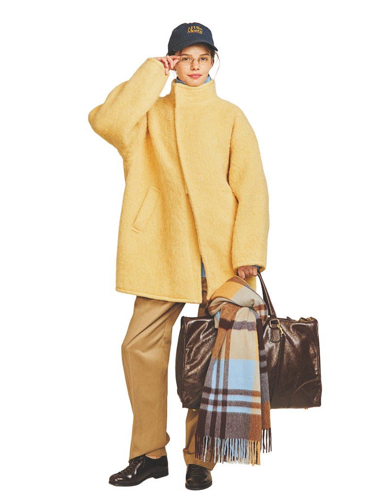 アルパカ混の糸を使用した、上質ウールのミドル丈コート。高発色なカラーでも大人っぽくさまになる、デザインを極力省いたミニマルルック。唯一目を引くカーブを描いたフロントラインで、イエローのキャッチーさと調和を図りつつ、モードなひとクセとして作用。