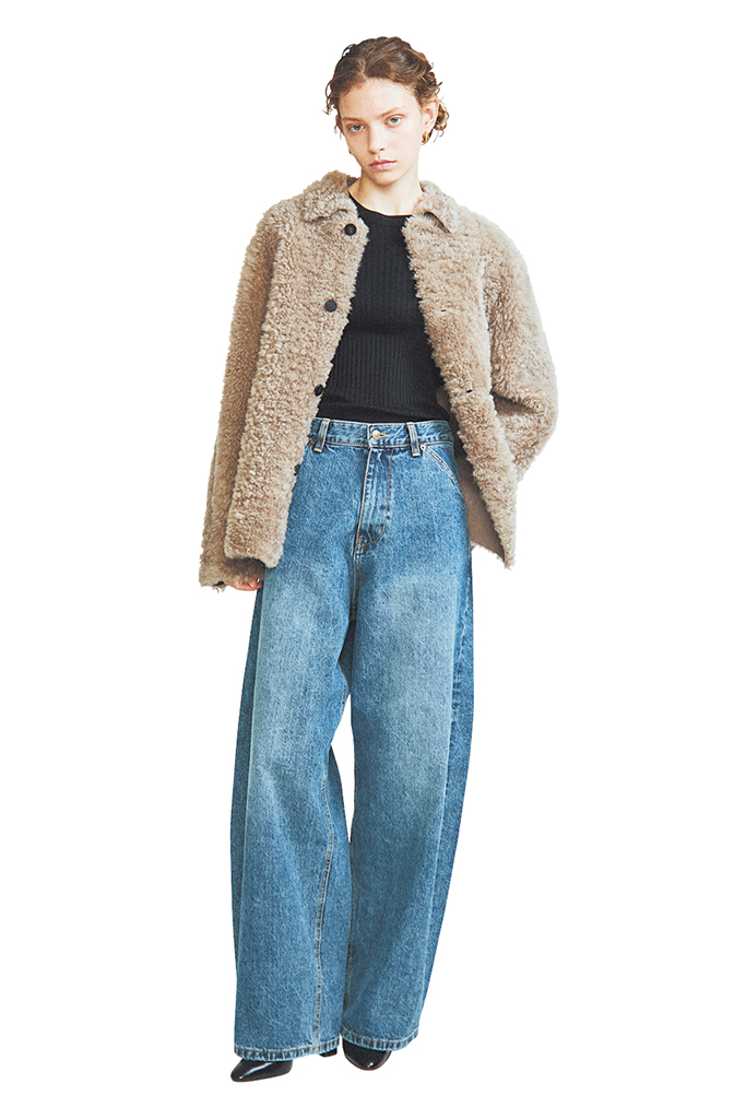 ブラウンメルトンジャケット 121,000円/ebure(LITTLE LEAGUE INC.) シャープなスクエアフォルム。えりはとりはずせてノーカラーにも。