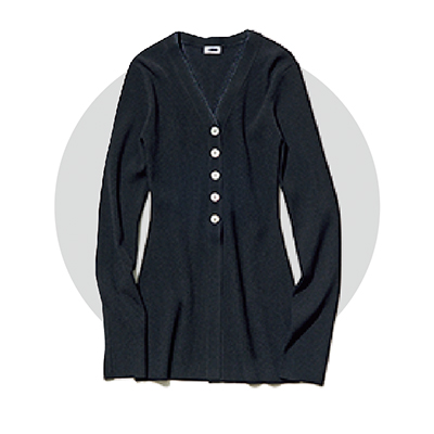 フロントボタンを腰あたりまでにとどめて逆Vを描くことで、長め丈にありがちな間のびを解消。安心感がありながらどんなボトムとでも脚を長く見せる高いウエスト位置をキープ。コケットな雰囲気がモダンに昇華。