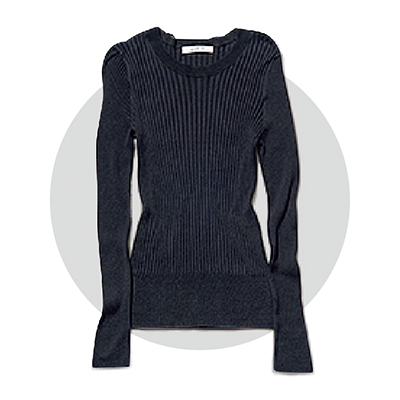 あたたかなアウターを着ることも増えるこれから。もたつきをおさえるため、中に着るトップスは極力コンパクトに。丸首なら、顔まわりのデザインにも干渉せずバランス良好。リブニットならカットソーよりクラス感のある仕上がりを約束。