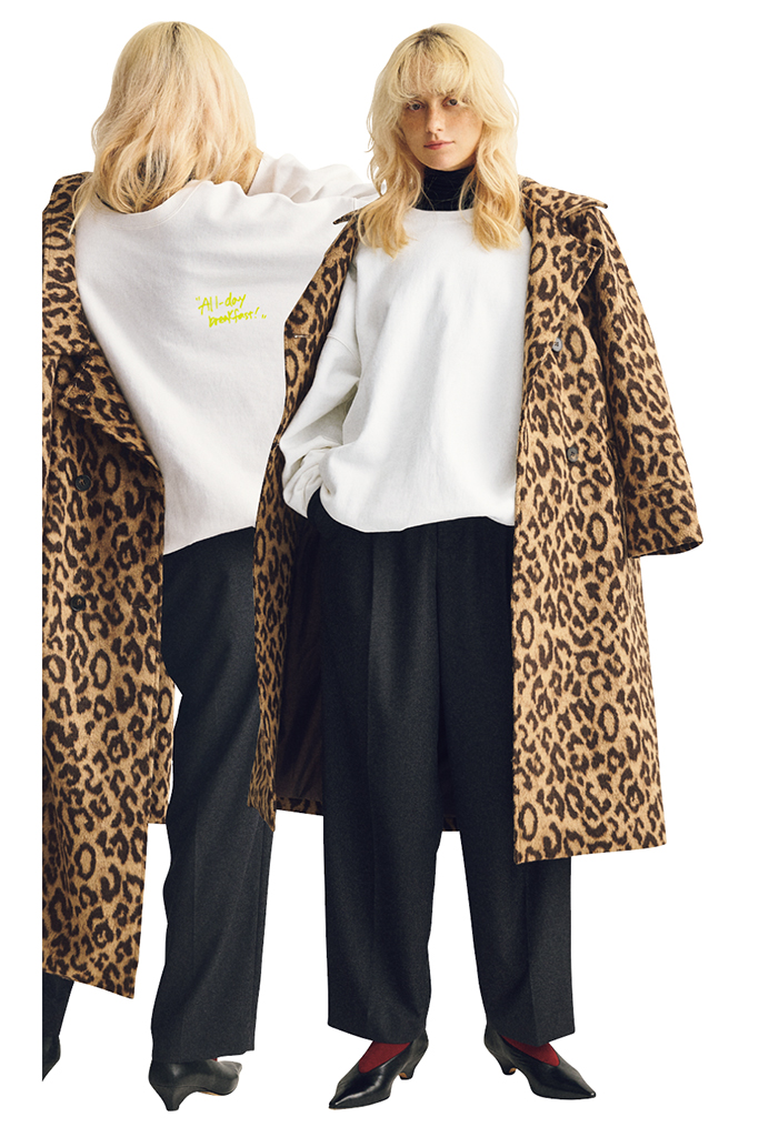 着心地重視でも、おのずときりりと見えるモノトーン。レオパード柄でおおい、輪郭をいっそうシャープに。コートが目を引くぶん、スエットのロゴは後ろに配置。