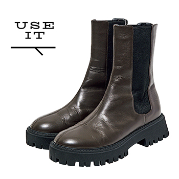 茶サイドゴアブーツ(4.5) 38,500円/ザ ポーズ(ウィム ガゼット ルミネ新宿店) クッション性に優れたインソール。スタイリングをじゃましない、ミニマルさが魅力のサイドゴア。筒が細くすっきりと見える形&マイルドなブラウンならボリュームが出にくく、女性らしい装いともマッチ。