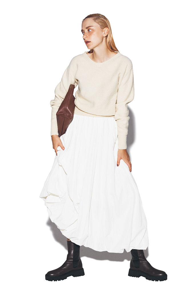 茶サイドゴアブーツははきまわし。白マキシスカート 26,620円/HER. 白セーター 38,170円/ベースレンジ(アダム エ ロペ) バッグ 49,500円/PUNTI.(ショールーム セッション) フレアとはまた違う、バルーンシルエットによる迫力のあるボリュームを主役にした白の上下。足元のブラウンが膨張を回避。
