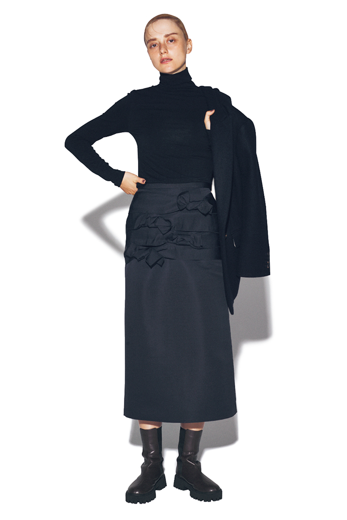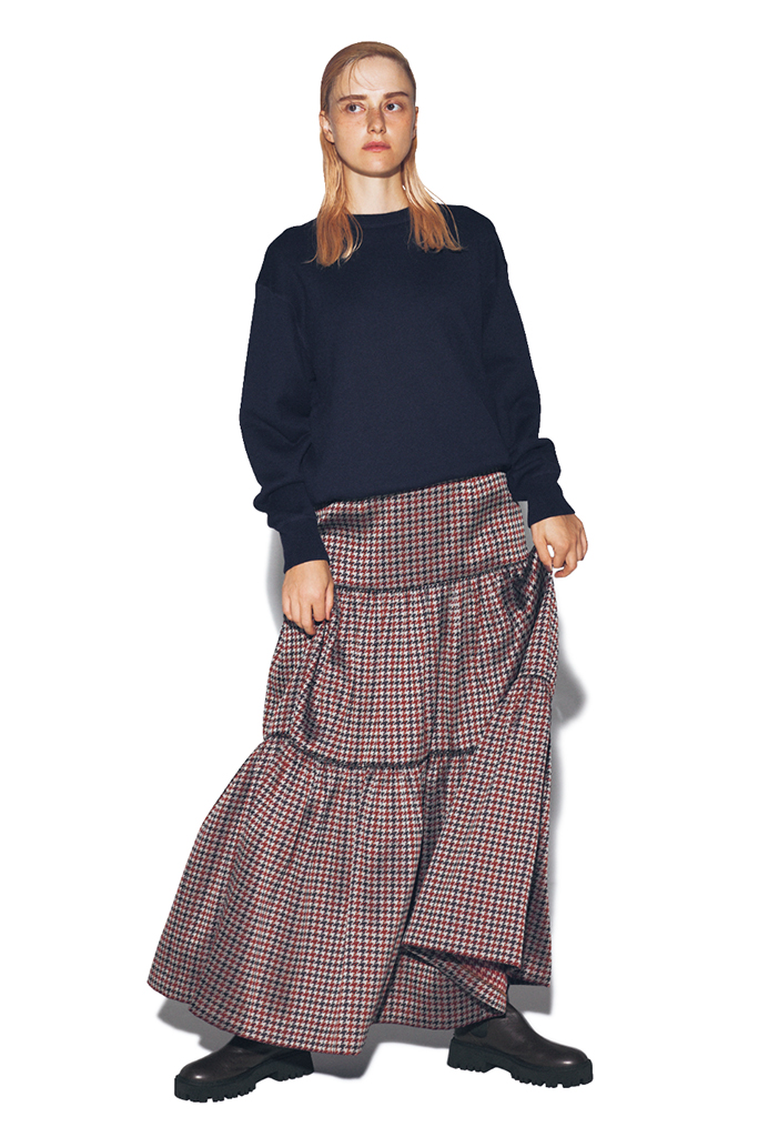 スカートのメルトン生地は、ダブルフェイスなのに軽いという特殊な仕立て。おかげで、スタイルカバーにつながる適度なハリ感、品のよさをもたらす縦落ち感を同時に獲得。クセのあるスリットラインで遊び心をそえて、まじめなアイテムにささいな抜けを演出。