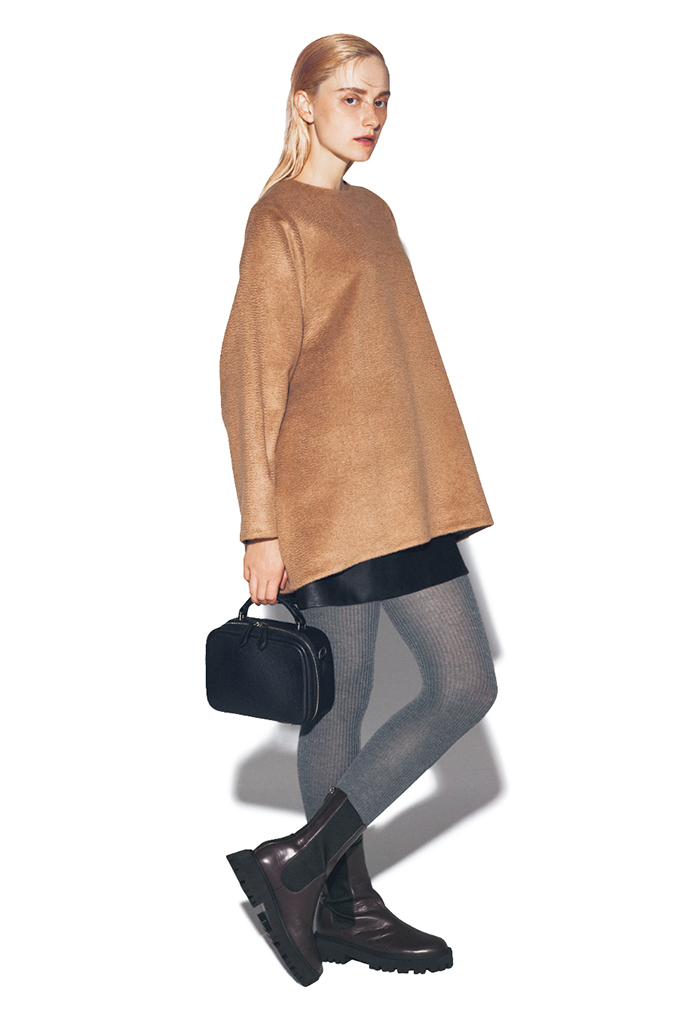 茶サイドゴアブーツははきまわし。黒スコート(オンライン限定) 9,990円/Gap ベージュプルオーバー 94,600円/BIYŌMA(ツカモトコーポレーション) バッグ 57,200円/土屋鞄(土屋鞄製造所) タイツ/スタイリスト私物 ミニ自体もレザーを選び、クラス感を意識。締まった足首でフラットながら見た目はすらりと。