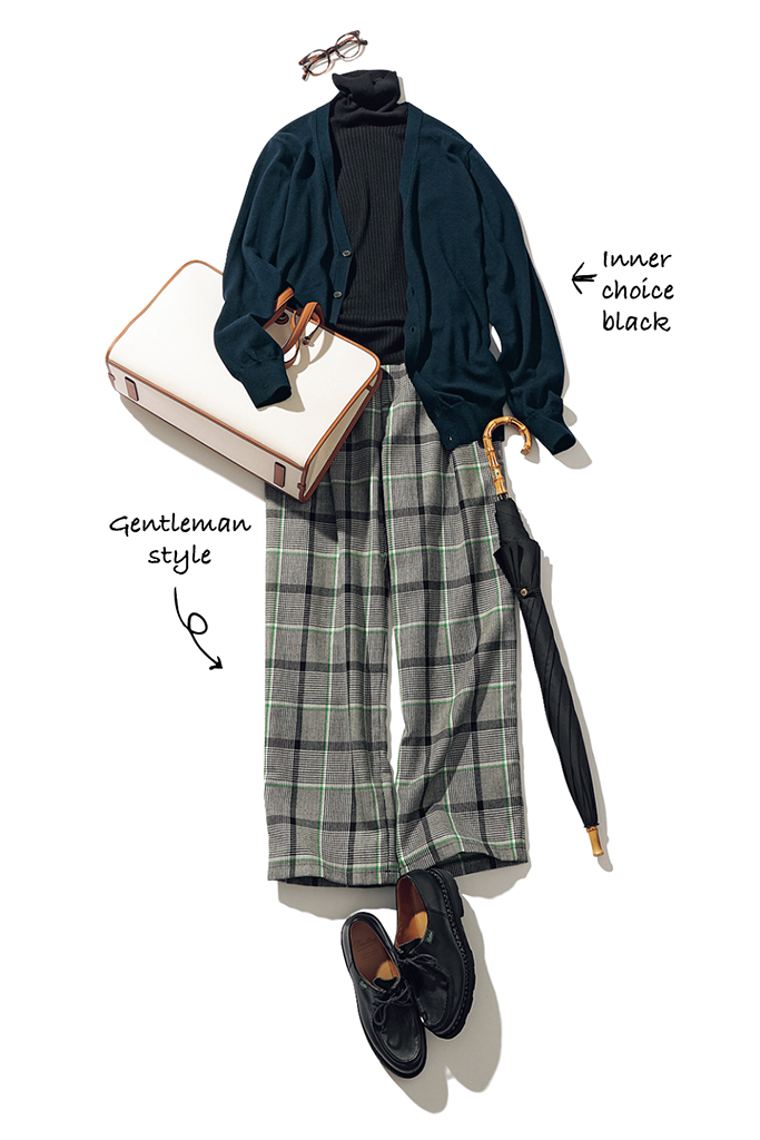 黒タートルネックニット 3,993円/フリークス ストア(フリークス ストア渋谷) ネイビーカーディガン 31,900円/SLOANE(ザ ショップ スローン 新静岡セノバ店) チェックパンツ 32,000円/ベッド&ブレックファスト(グリードインターナショナル) 眼鏡 42,900円/プロポ(プロポデザイン) バッグ 29,700円/SOMEWHERE STUDIO(ショールーム セッション) 傘 14,300円/トラディショナル ウェザーウェア(トラディショナル ウェザーウェア 渋谷店) シューズ 94,600円/パラブーツ(パラブーツ青山店)