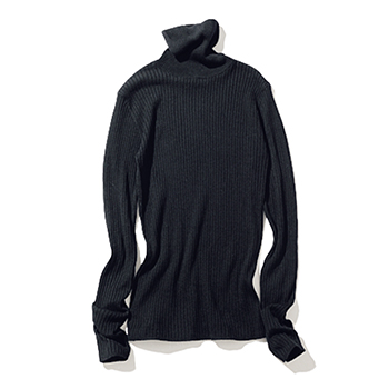 1枚で着る前提でリブタートルを選ぶなら、くったりよりもしっかりとした生地選びが重要に。体の凹凸を目立たせないだけでなく、さまになる迫力まで得られる。アレンジの効くそでが端正な装いの隙につながるささやかな飾りに。