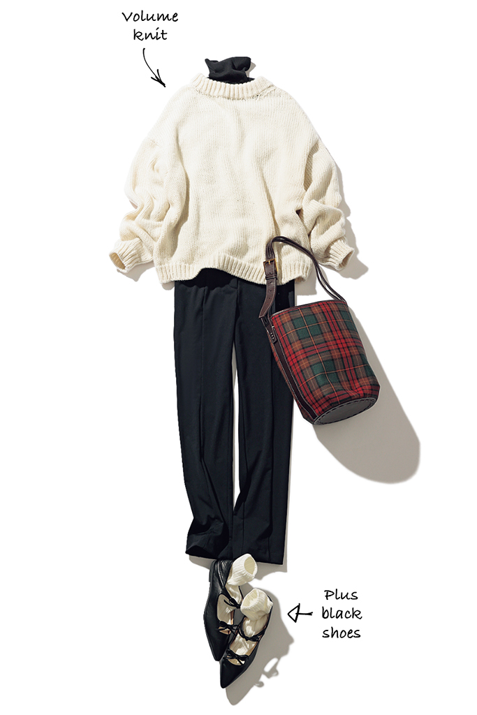 ボリュームが気になるときこそ、スレンダーな黒の出番。タートルネックニットとスキニーなパンツをつなげて縦のラインを維持すると、オーバーサイズの白ニットで包み込んでも膨張感を防げる。