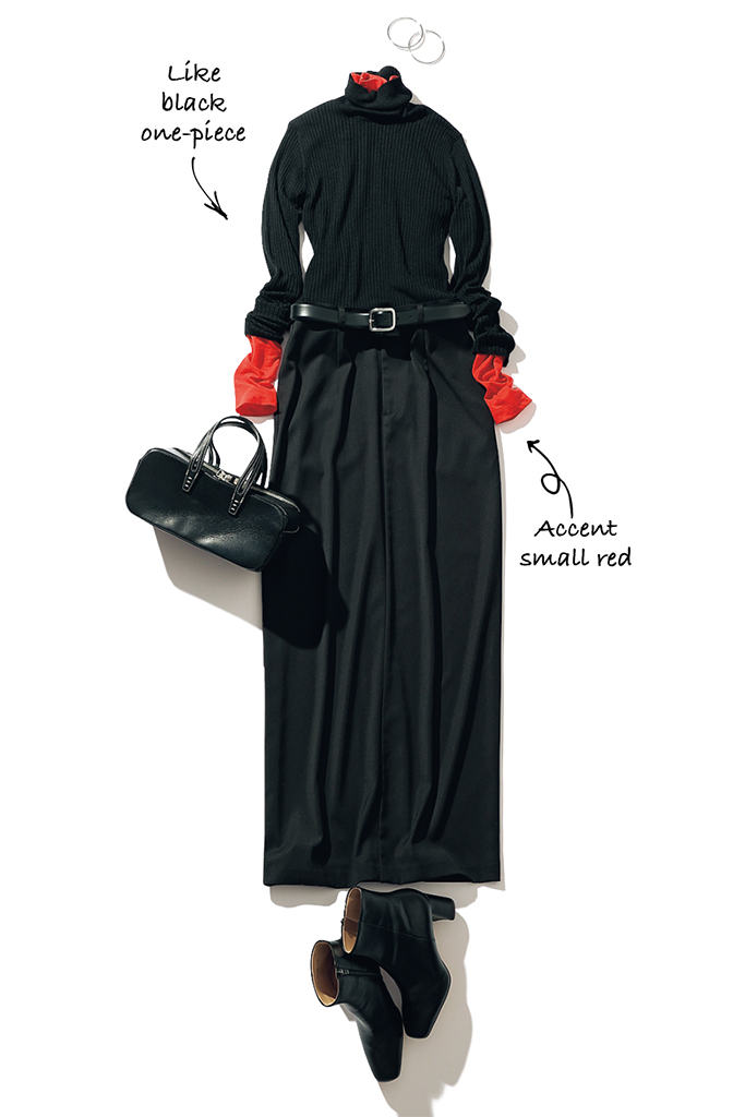 ドッキングニット風に、スリムなタートルネックどうしをレイヤード。黒の細身スカートで一体感を高めると、鮮烈な赤を脇役としてまとまりよくとり込める。