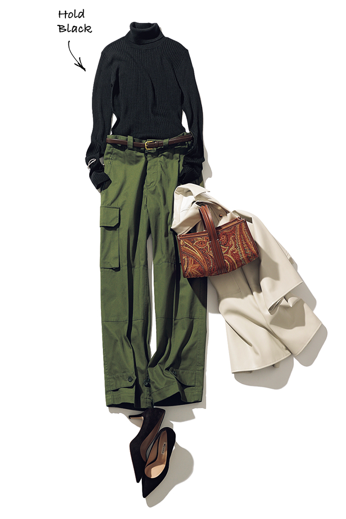 黒タートルネックニット 3,993円/フリークス ストア(フリークス ストア渋谷) カーゴパンツ 39,600円/Tangent(ザ エディット ストア) 白ジャケット 37,400円/HER. バングル 34,320円/BULBS(ZUTTOHOLIC) ベルト 8,800円/ルメン バッグ 51,700円/A VACATION(ノーベルバ) パンプス 18,150円/ダイアナ(ダイアナ 銀座本店)