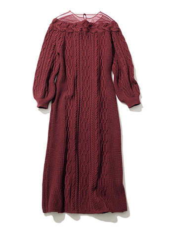 ニットワンピース 26,400円/Ameri ざっくり編みのケーブルニットにギャップを生む、繊細なシアーなえりもと。丸みのあるパフスリーブでレディな色みとディティールにやわらかさを。