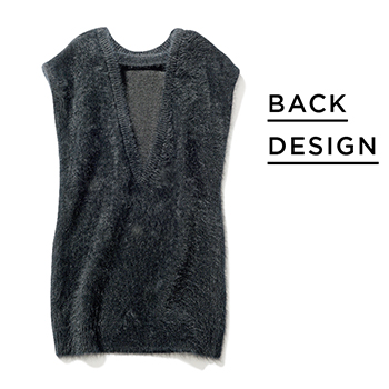 部分的な背中の開きが、ピュアな白の抜けにつながる。甲までおおうサムホールつきで、手元はアクセいらず。なめらかなアルパカ混の生地。