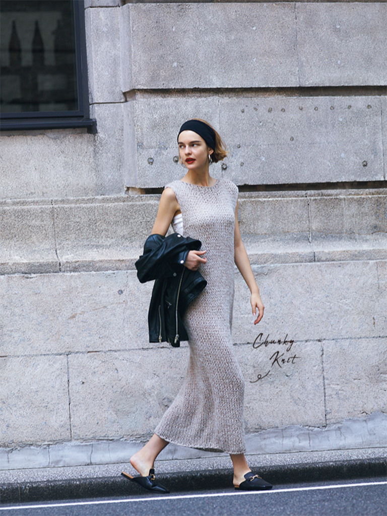 体へのほどよいフィット感とノースリーブから伸びる腕が、想像力をかき立てるニット素材のあざとさ。つつましきベージュなら、露骨なセクシーさとは無縁。顔まわりの小物でキャッチーに促して。