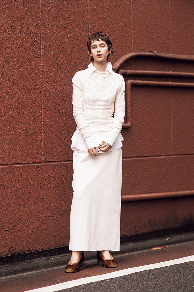 白ニット 58,300円/マーレット(LITTLE LEAGUE INC.) 中に着た白シャツ(タイつき) 18,920円/FRAY I.D(FRAY I.D ルミネ新宿2店) 白スカート 26,400円/エモエレ(アダム エ ロペ) シューズ 38,500円/PIPPICHIC(ベイジュ)