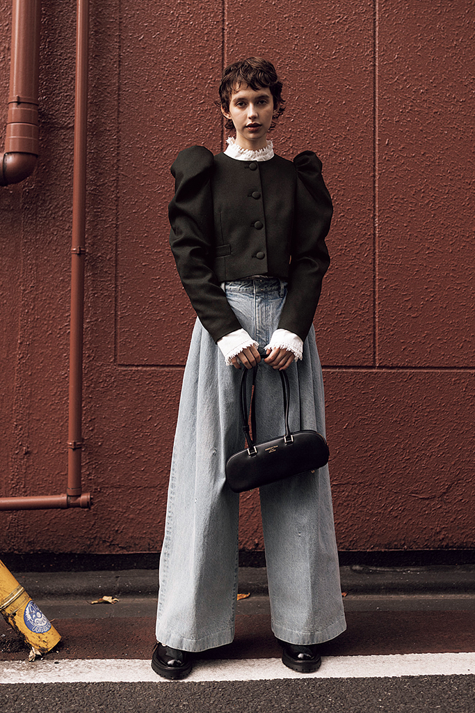 黒ジャケット 81,400円/CORCOVADO(フィルム) 白レースブラウス 31,900円/HER. ブルーデニムパンツ 48,400円/タナカ(サロン アダム エ ロペ) バッグ 36,300円/クリスチャン ヴィラ(デミルクス ビームス 新宿) シューズ 69,300円/SACRA(インターリブ)