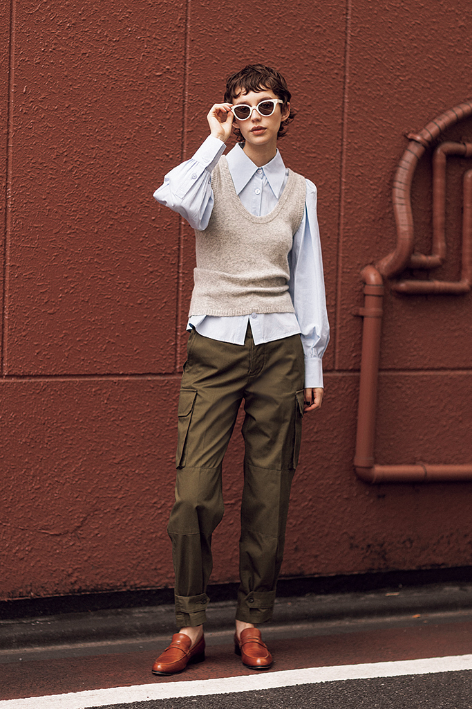 グレーニットタンクトップ 18,700円/styling/(styling/ ルミネ新宿1店) ブルーシャツ 15,180円(参考価格)/GHOSPELL(ザ・ウォール ショールーム) カーキパンツ 39,600円/Tangent(ザ エディット ストア) サングラス 48,400円/プロポ(プロポデザイン) ローファー 16,390円/A de Vivre