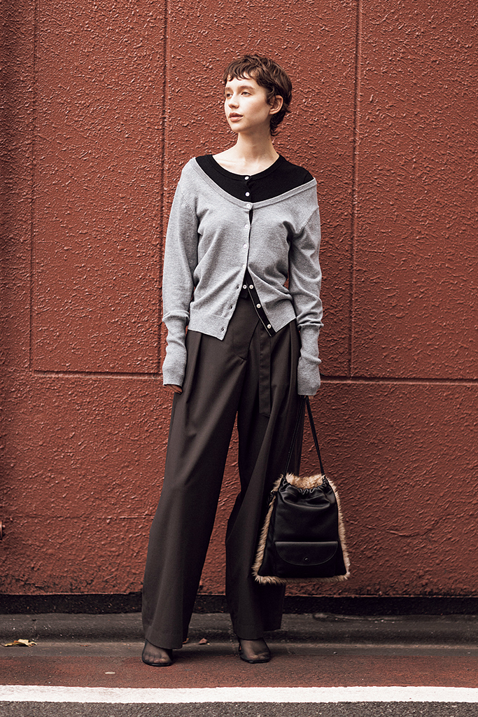 グレーカーディガン(中に着た黒カーディガンとセット) 19,800円/MAISON SPECIAL(メゾンスペシャル 青山店) ブラウンパンツ 31,900円/エイチ ビューティー&ユース バッグ 39,600円/VASIC(ヴァジックジャパン) サンダル 44,000円/DOUBLE STANDARD CLOTHING(フィルム)