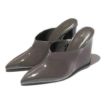 グレーエナメル風レザーミュール(10,5) 7,990円/ZARA(ザラ カスタマーサービス) 黒よりも緊張感が和らぐグレーで思い切り鋭いデザインを採用。ボトムのすそからのぞかせるだけで、シンプルな装いに浮かない新鮮味が得られる。