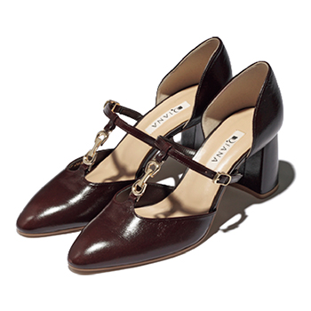 ブラウンTストラップシューズ(6) 20,350円/ダイアナ(ダイアナ 銀座本店) 後ろ姿もスリムに見せるシャープなかかと。トゥとストラップをつなぐゴールドで、限られた要素のなかでクラス感をおぎなうワザありデザイン。十分なホールド感で歩きやすい。