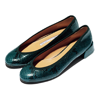 ブルーパイソン柄バレエシューズ(3) 64,900円/ペリーコ(アマン) 辛口要素の強いパイソン柄に挑戦しやすい、ミニマルなシェイプのバレエシューズ。可愛らしい形でキレのいい色・柄のアンバランスさが、シンプルなドレスやスカートを凝って見せるひとクセに。
