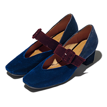 ブルー×ボルドーパンプス(4,5) 25,300円/オゥ バニスター(アバハウインターナショナル オンラインストア) 甲のV字カットでベロアにキレを。角が立ちすぎないスクエアトゥはフォーマルにもカジュアルにも向く合わせやすい形。