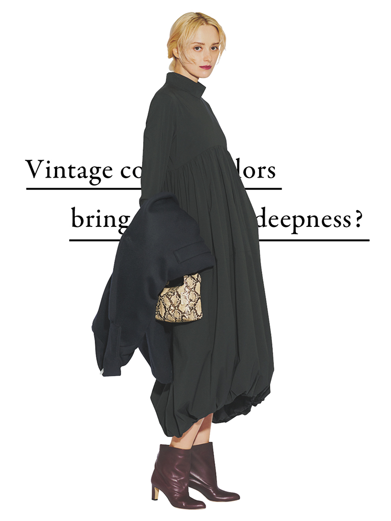 いつもの装いに奥行きが加わる、黒の延長で使えるダークトーン。色自体に鮮度がそなわっているから、デザインは極力シンプルにおさえることがポイント。